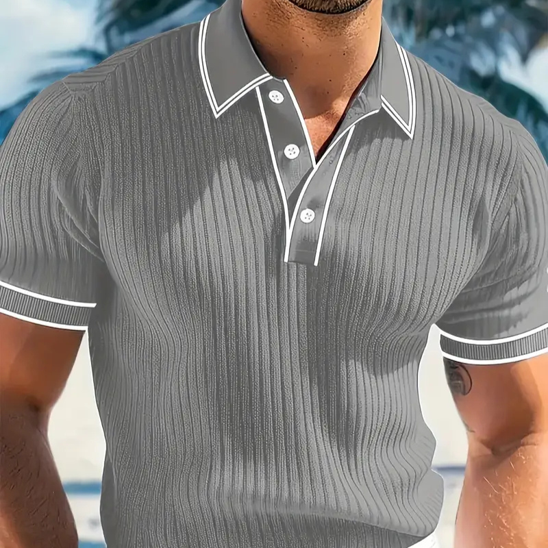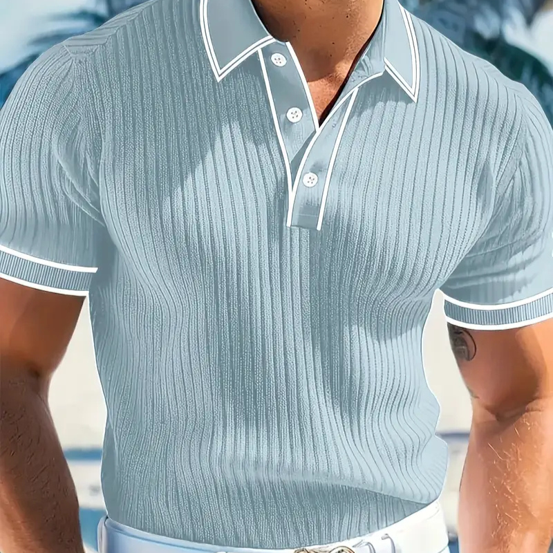 The Sebastian Polo blends refined continental tailoring with relaxed Mediterranean ease a statement piece for men who dress with intent. With its bold vertical rib texture, crisp contrast detailing, and structured 3-button placket, Sebastian is sharp, sculpted, and ready for warm-weather sophistication.