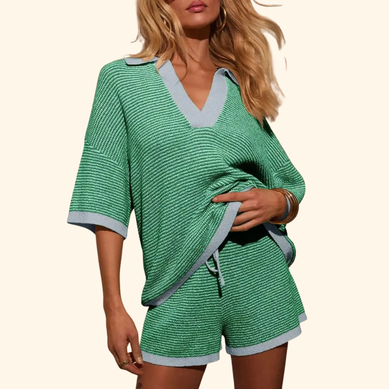 The subtly ribbed texture and chic contrast trim give this set a refined edge, while the collared V-neck and relaxed silhouette keep things cool and casual. Made with a soft, stretchy polyester blend, it feels as good as it looks no fuss, all style.